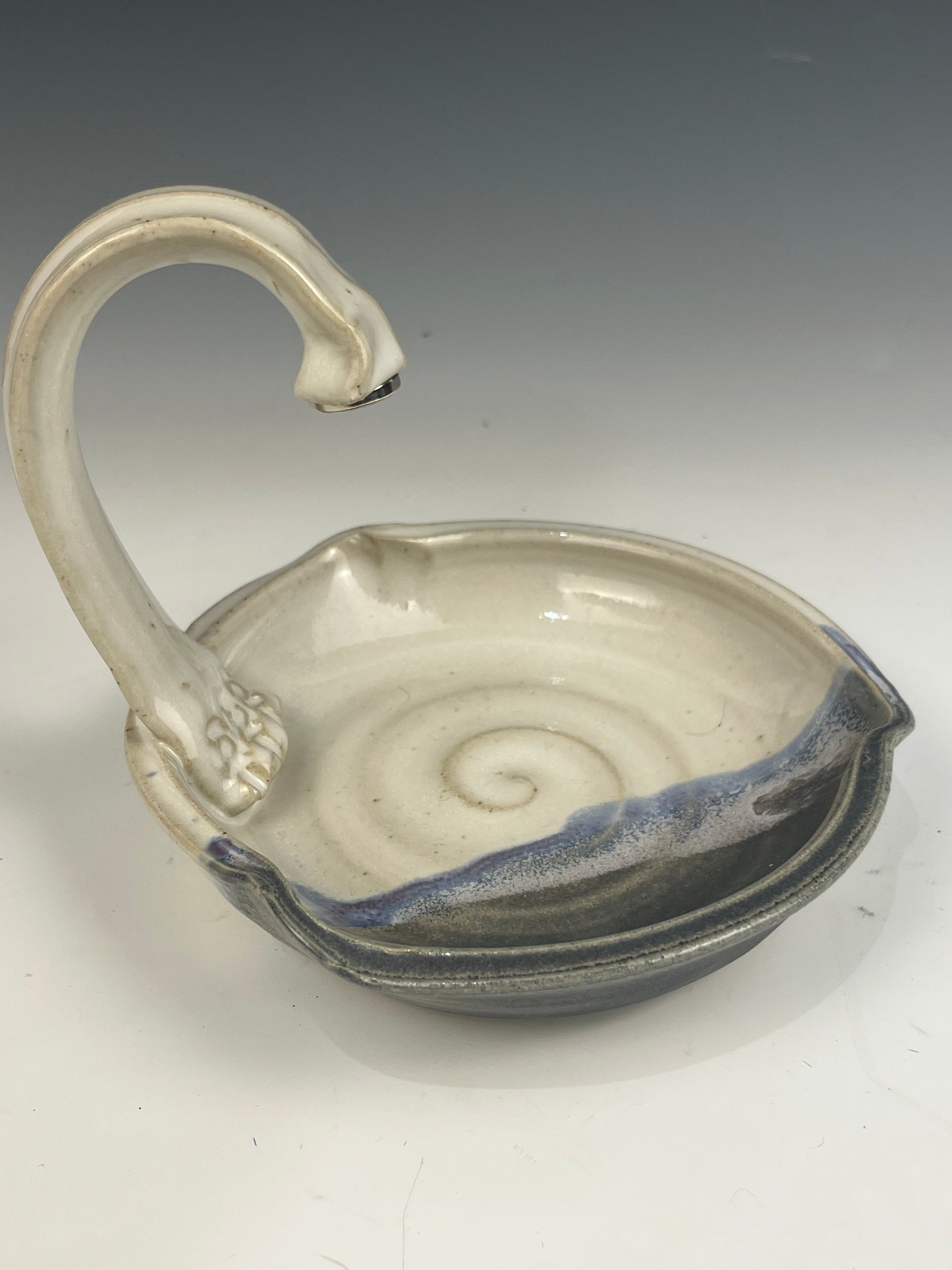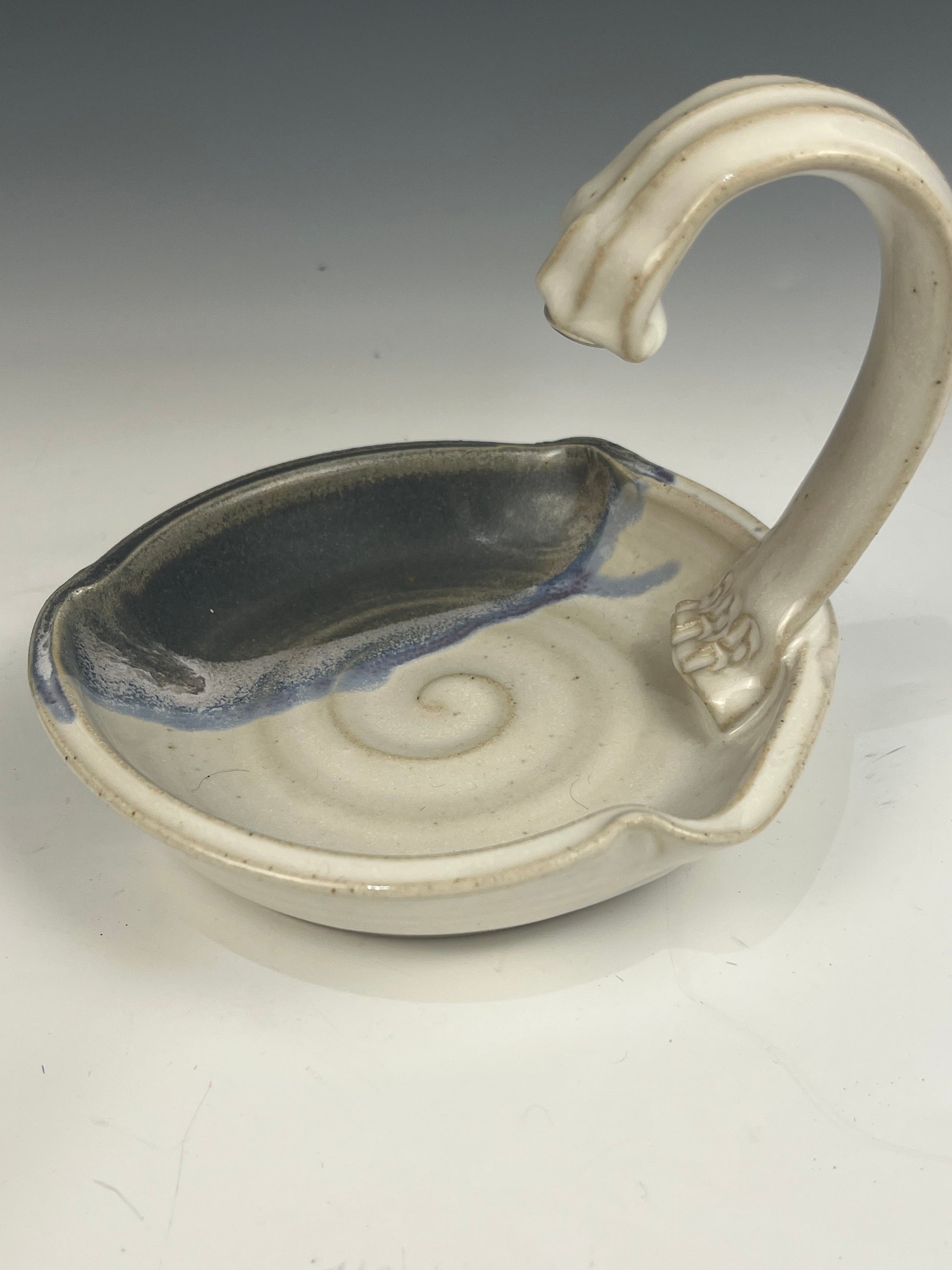 Soft white and grey tones with a splash of lavender, magnetic hanging soap dish with arched handle 11cm high, 13cm dia.