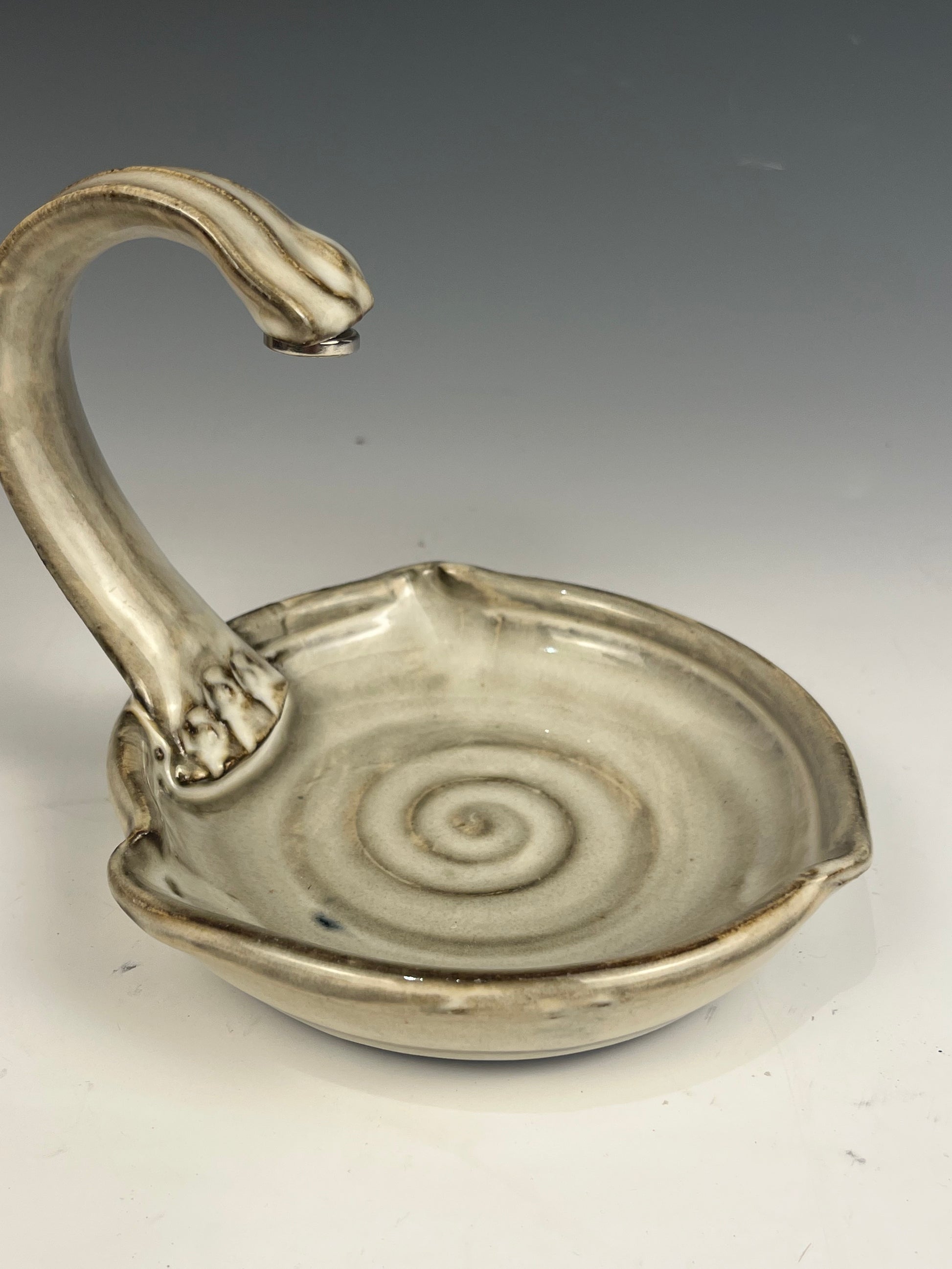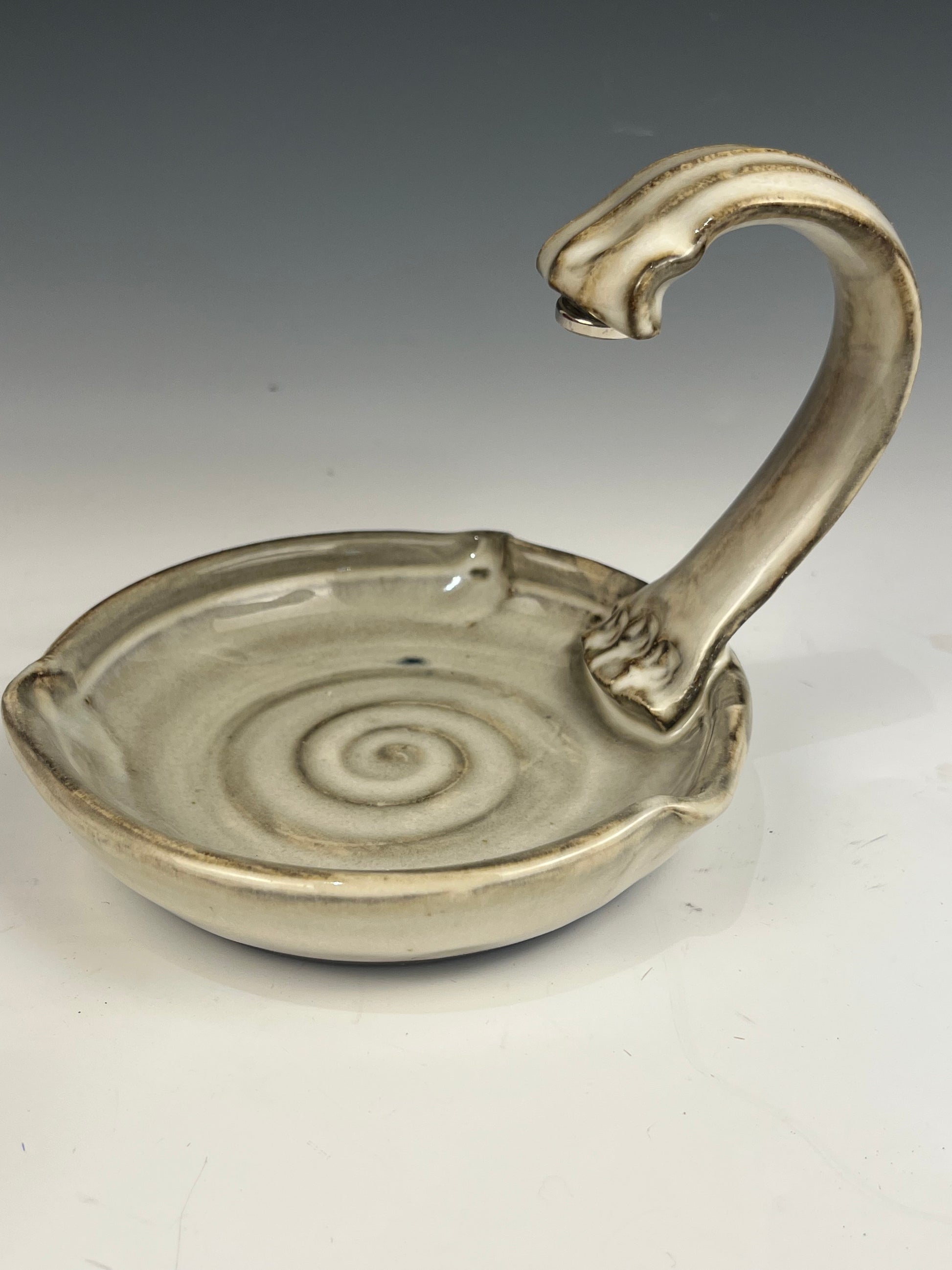 Cream and caramel magnetic hanging soap dish with arched handle 11cm high, 12.5cm dia. These soap dishes were born from a desire to make bar soap a pleasure to use. These dishes make your soap last longer and prevent that slimy mess traditional dishes tend to accumulate. They are truly a game changer in terms of happiness with bar soap.