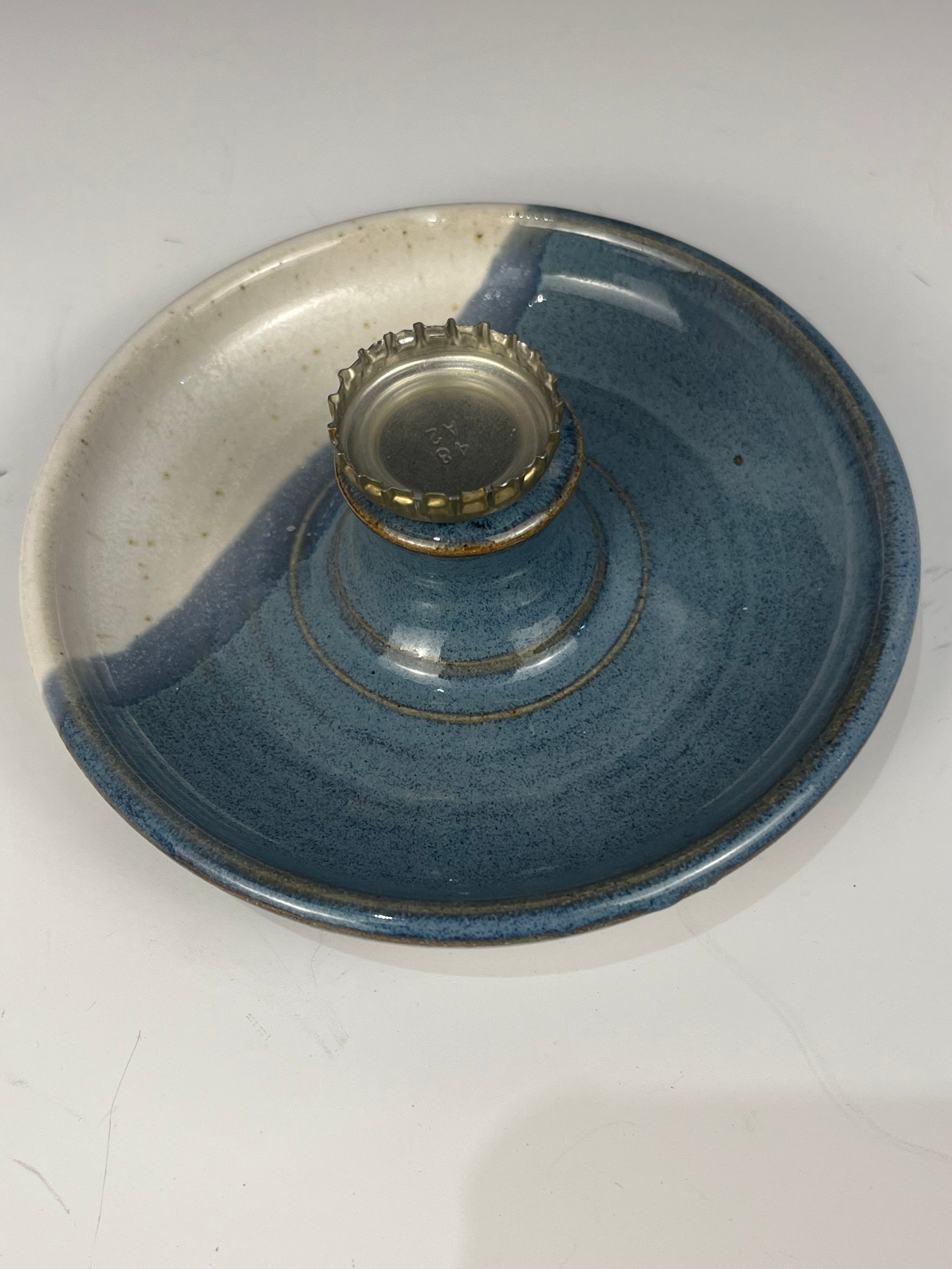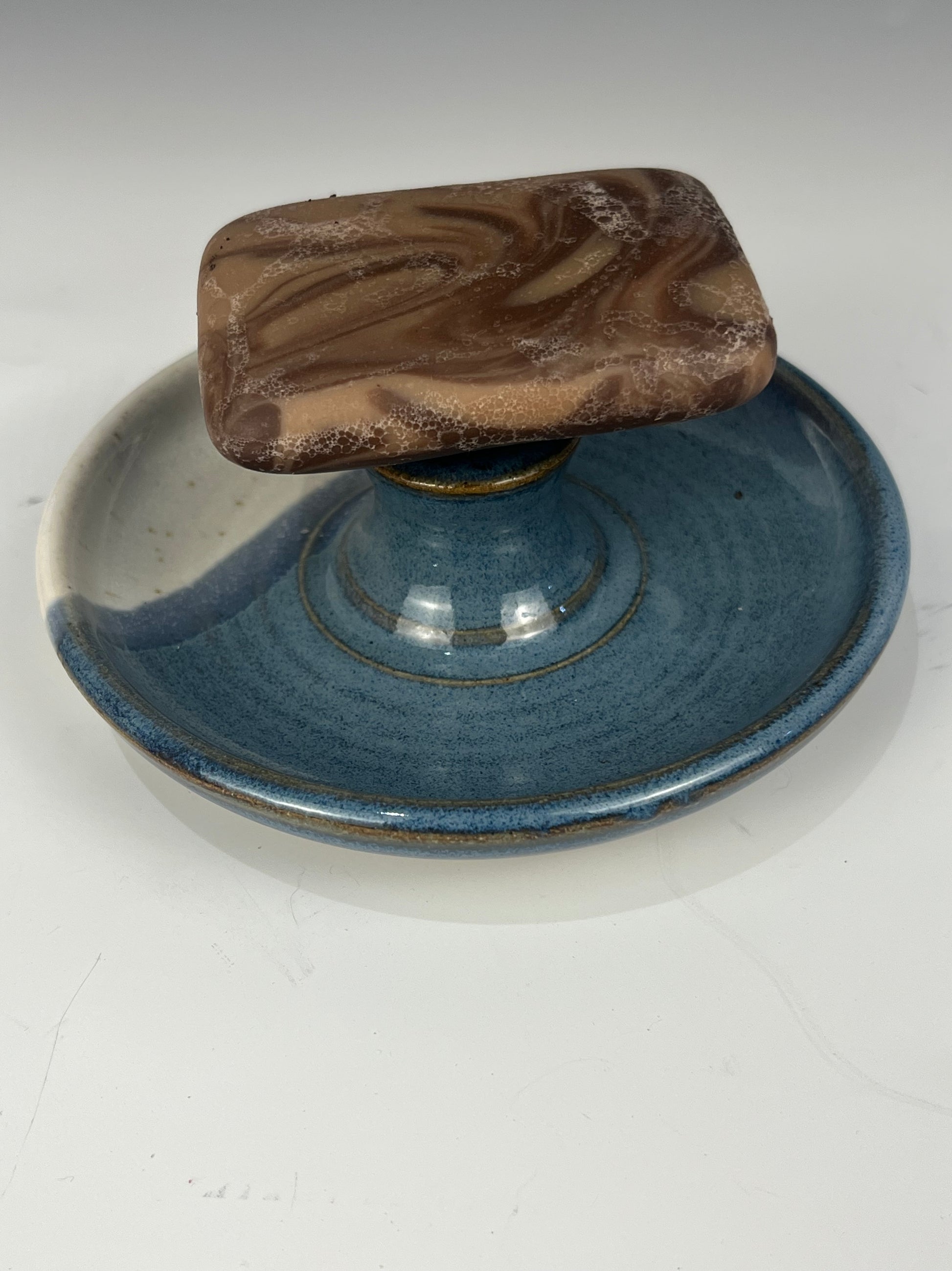 Blue and speckled white magnetic pedestal style soap dish 6cm high, 12cm dia. This is a different take on the arched or hanging soap dishes, they are less fragile and easier to ship while also keeping your soap high and dry. These soap dishes were born from a desire to make bar soap a pleasure to use. These dishes make your soap last longer and prevent that slimy mess traditional dishes tend to accumulate. They are truly a game changer in terms of happiness with bar soap.