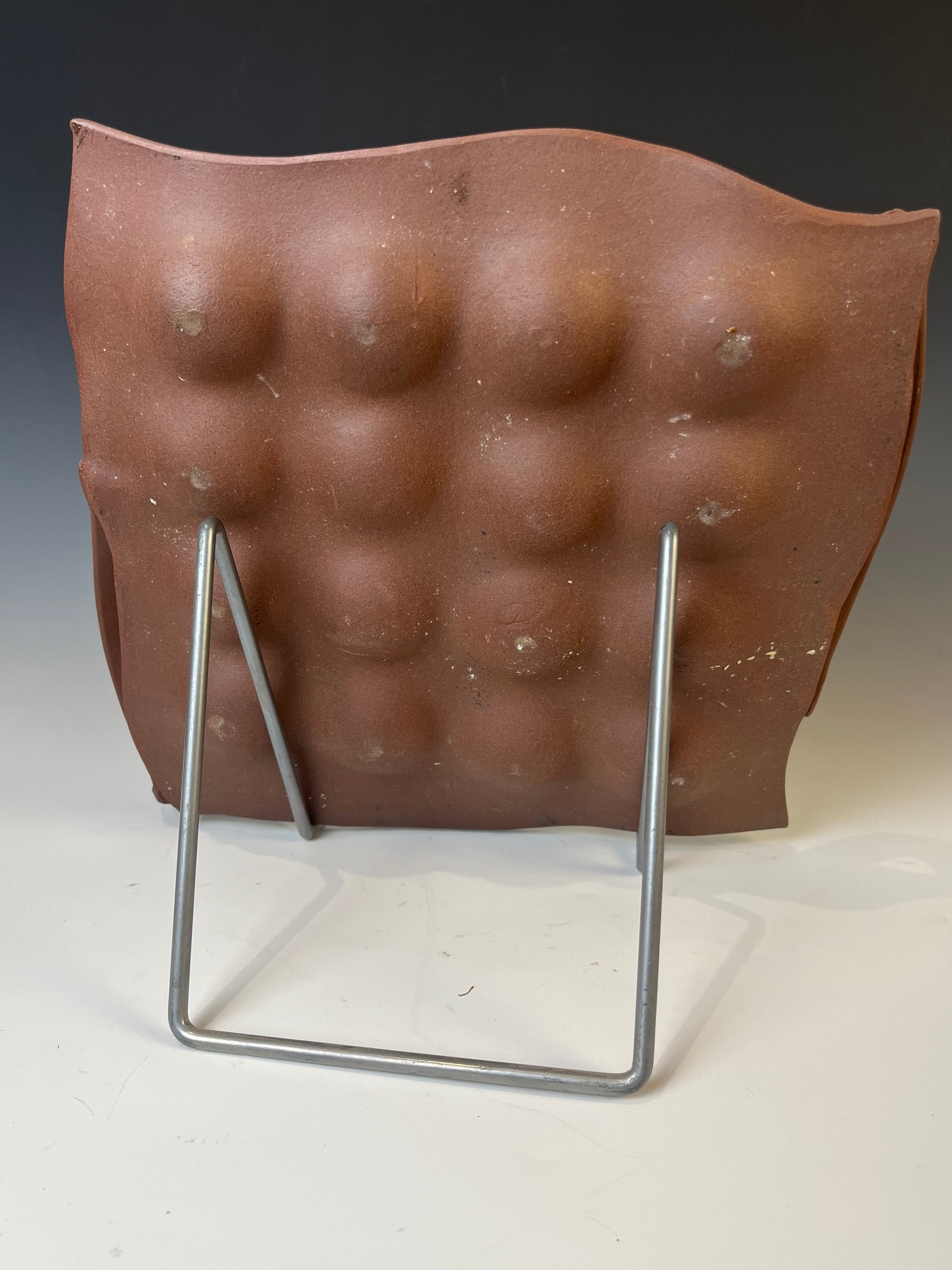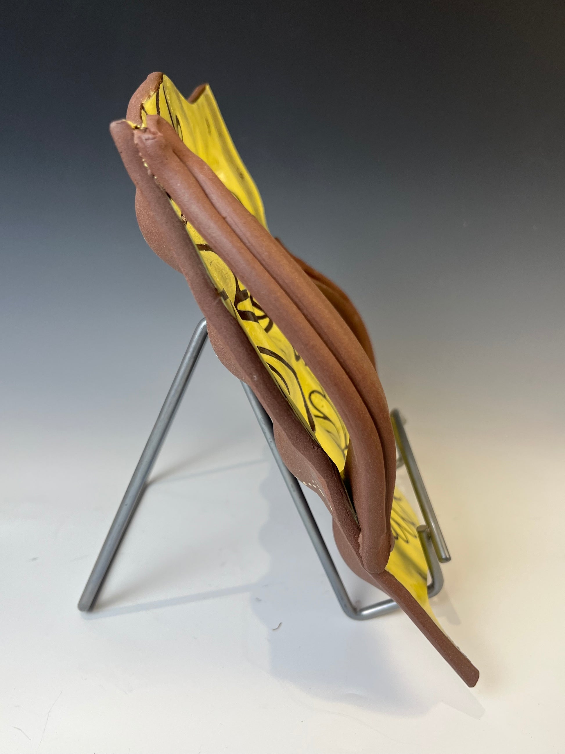 While most people use these trays to serve devilled eggs in, I have a backyard flock of chickens and love to use these trays to set out my eggs when I am baking, prepping for a meal or just want to admire the rich colored shells of my hens. It holds 16 med to large eggs, weighs 865g, measures 25x25 including the handles. This tray is decorated on dark clay with a colorful slip to accentuate the richness of the clay.