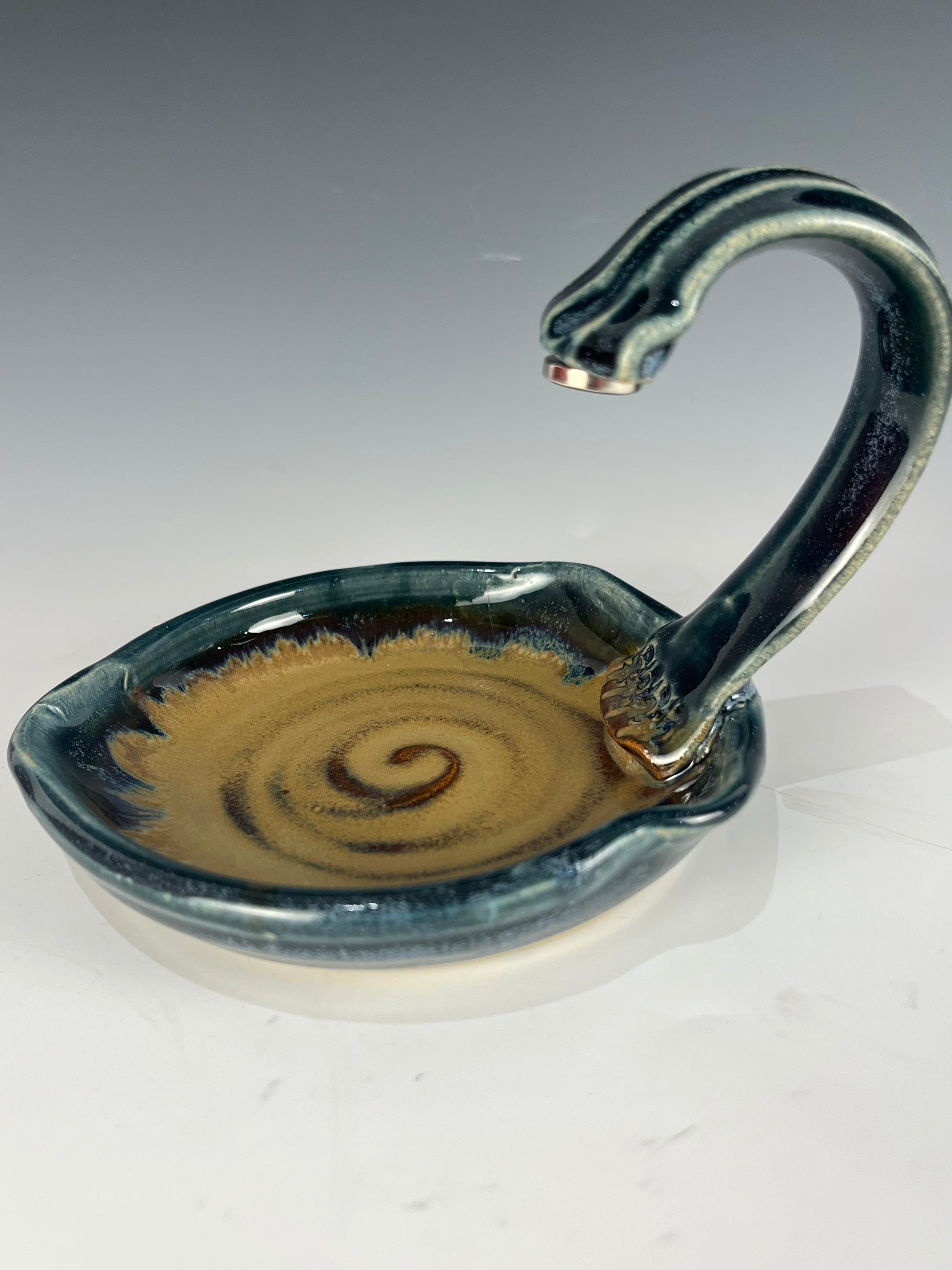 Blue and brown magnetic hanging soap dish with arched handle 11cm high, 12.5cm dia. These soap dishes were born from a desire to make bar soap a pleasure to use. These dishes make your soap last longer and prevent that slimy mess traditional dishes tend to accumulate. They are truly a game changer in terms of happiness with bar soap. magnetic soap dish with arched handle 10.5cm high, 13cm dia