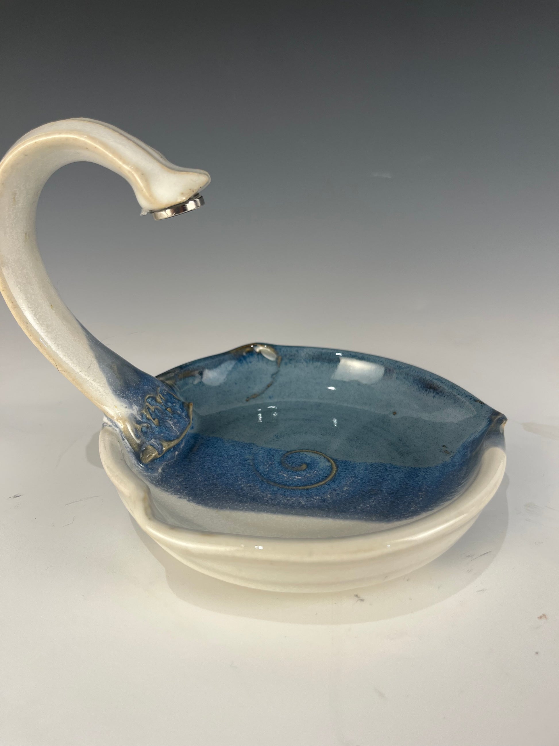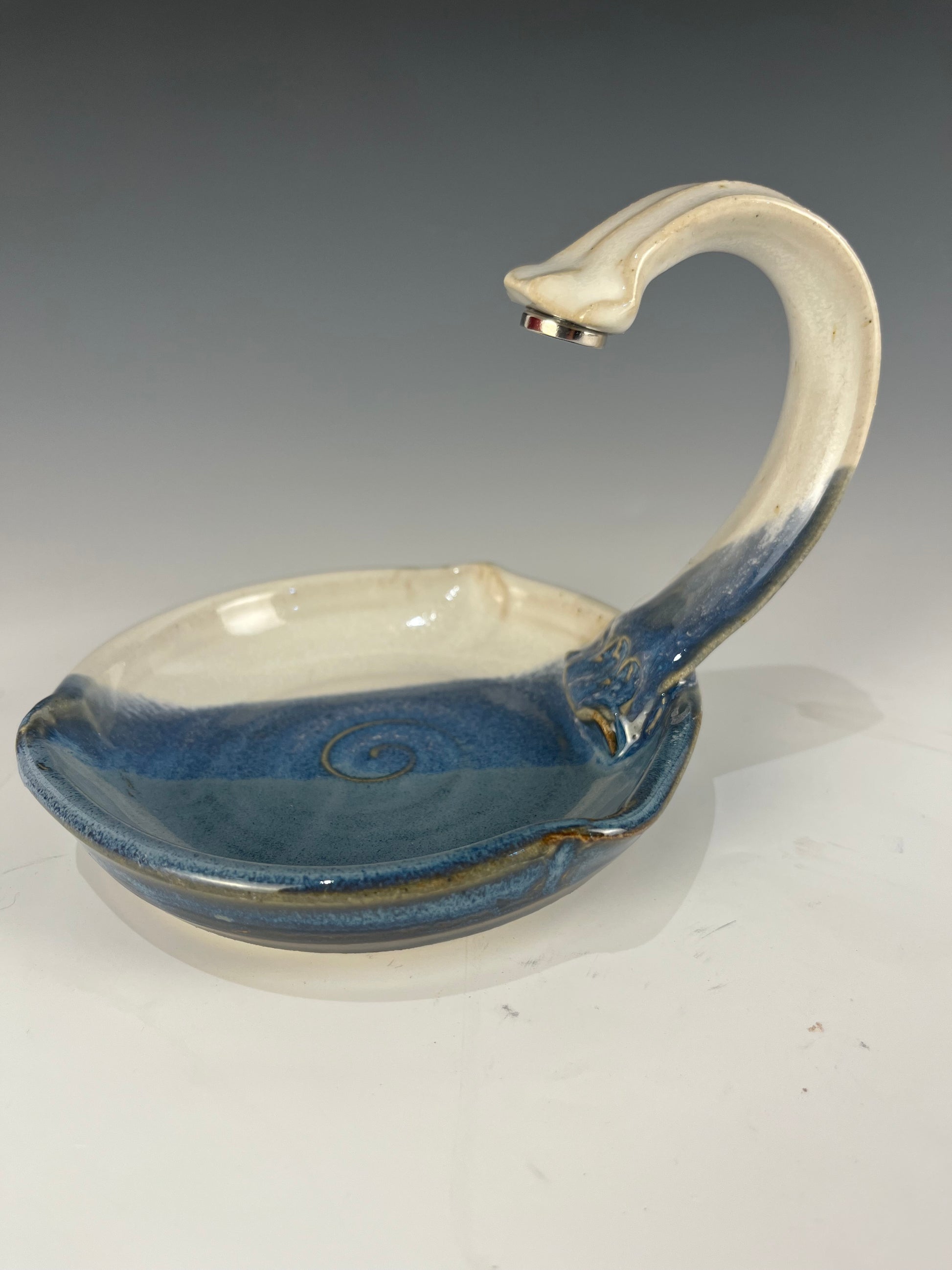 Blue and white hanging soap dish with arched handle 11cm high, 12.5cm dia. These soap dishes were born from a desire to make bar soap a pleasure to use. These dishes make your soap last longer and prevent that slimy mess traditional dishes tend to accumulate. They are truly a game changer in terms of happiness with bar soap. magnetic soap dish with arched handle 10.5cm high, 13cm dia