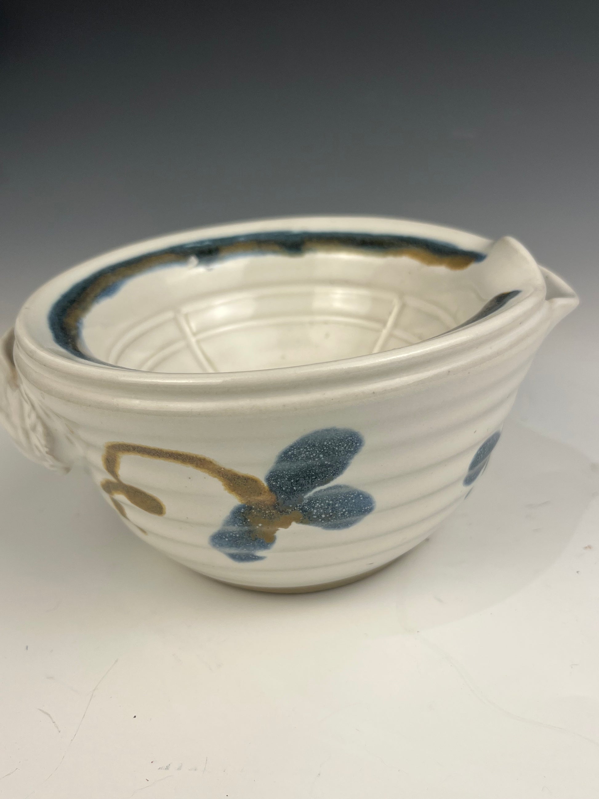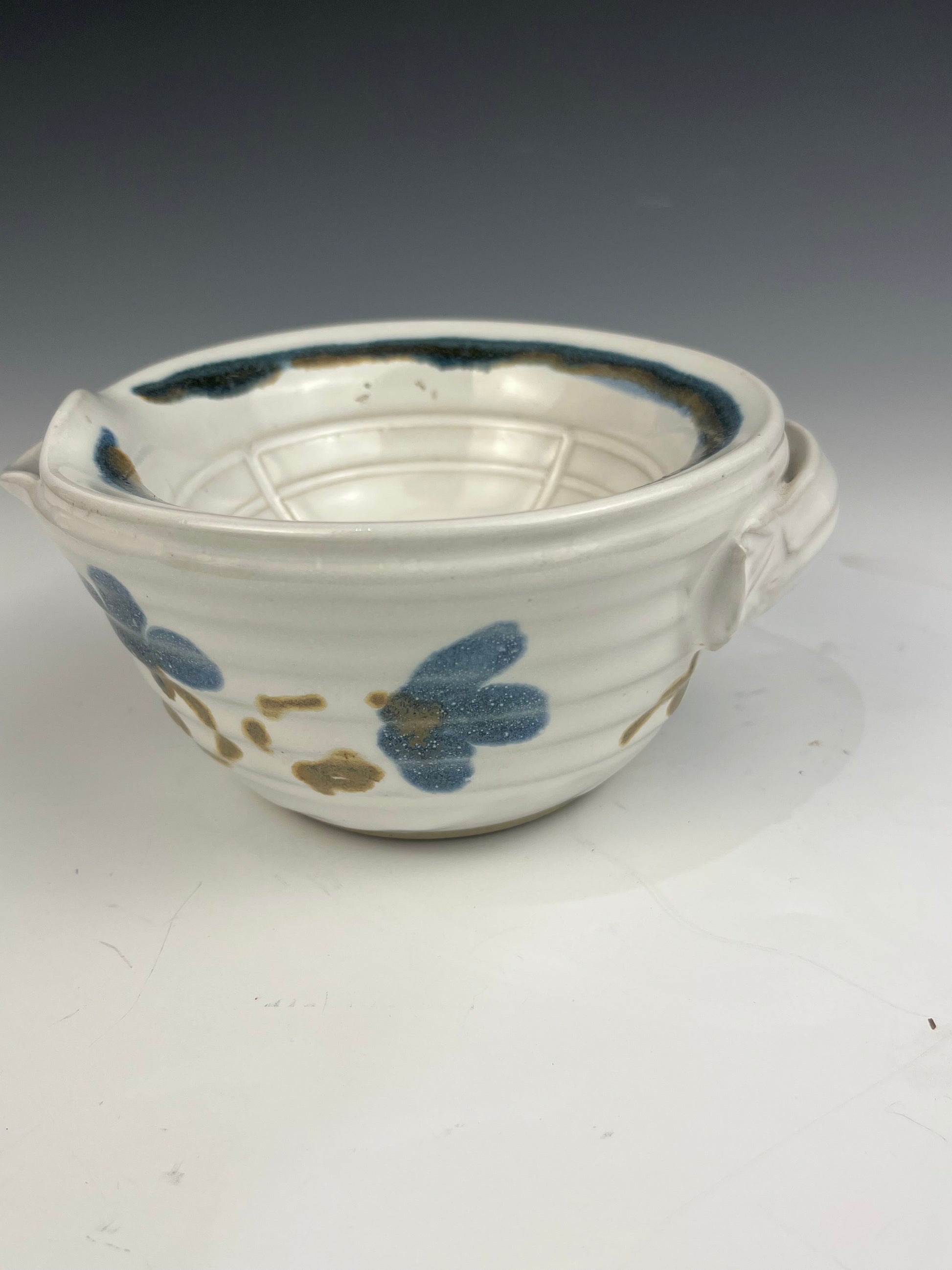 Scuttle Dish..Shaving bowl..this piece is white with blue and amber highlights made with an interior cavity that holds hot water to keep suds warm. The top inner bowl is used to create a nice thick lather whether you make your own soap as I used to, or buy it from your local soap maker. This piece comes with the shaving brush.