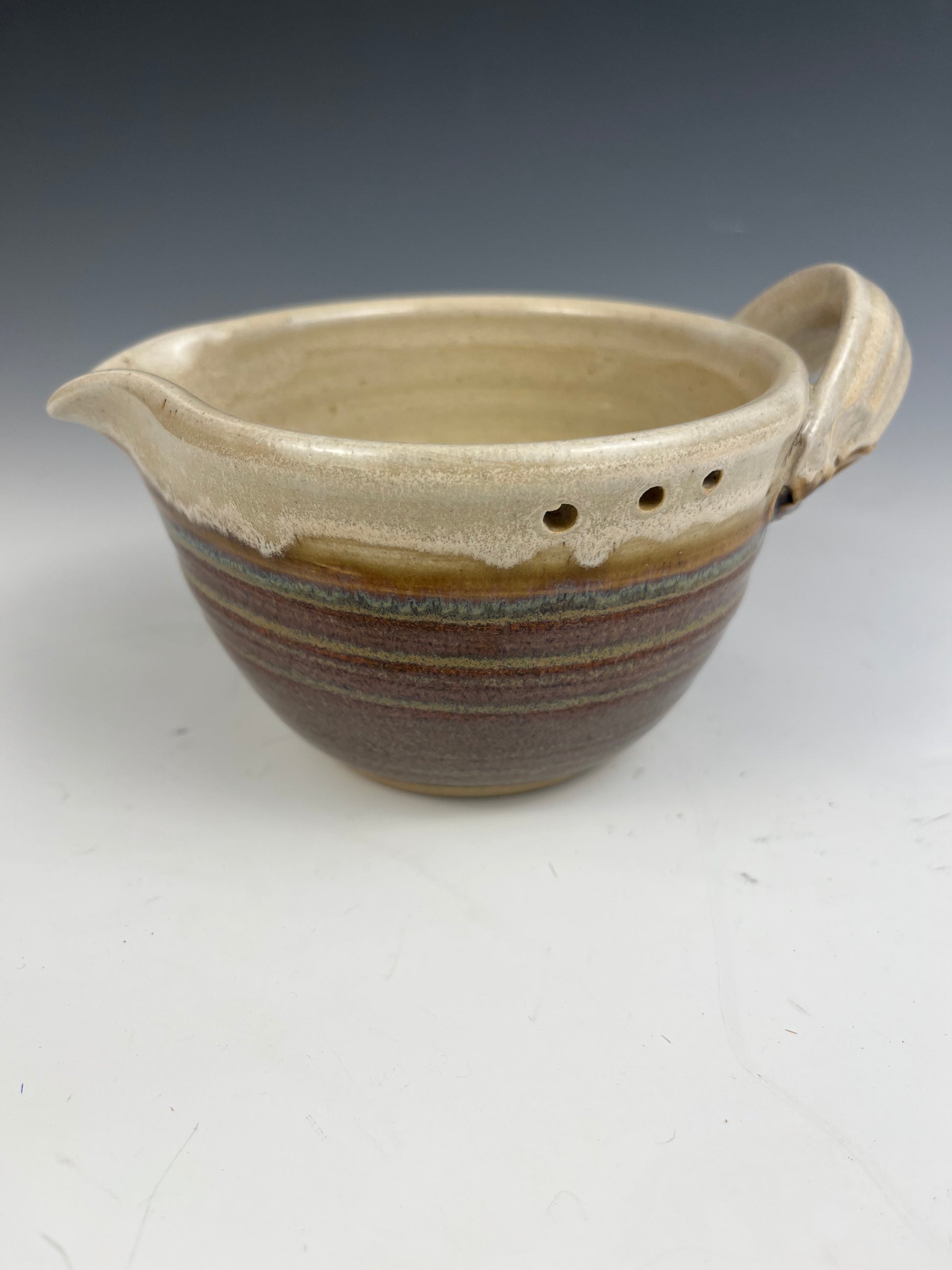 Cream and grey/brown marinade bowl, designed for function and its also a cute little bowl. There is a ginger grater in the bottom of the bowl which will grind garlic and ginger into a lovely paste and the various sized holes near the rim allow herbs to be stripped right into your dressing or marinade. 8cm x 12cm. 9oz