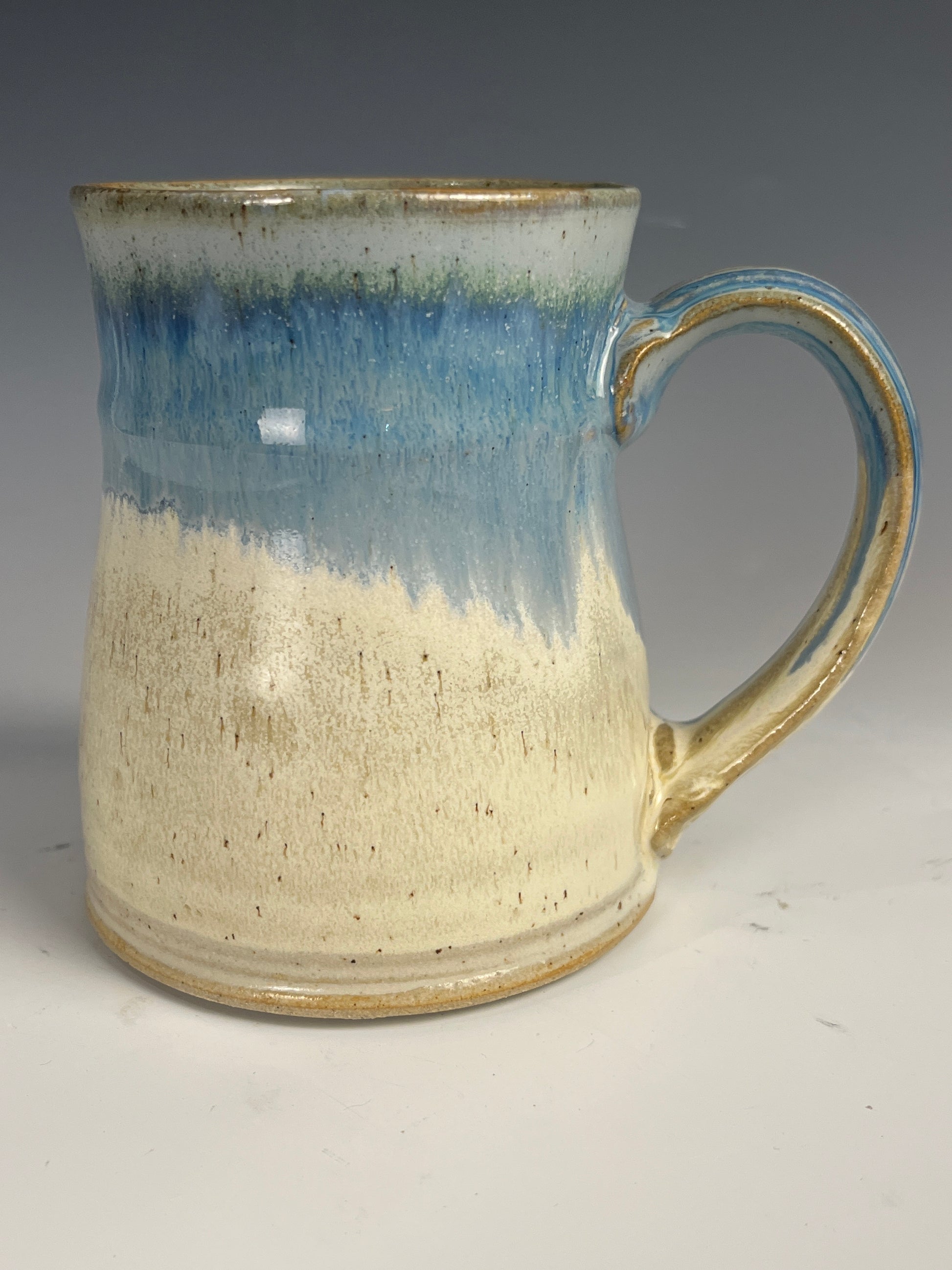 Light blue and white mug of 12oz with a handle. 10cm x 7.5cm
